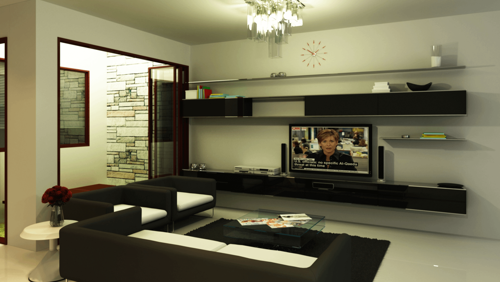 • Inside, the living area features an open-plan layout with a view towards the center void, an open-air vertical space designed for natural light and cross-ventilation. This void not only enhances air circulation but also visually connects all three floors, creating a sense of openness.