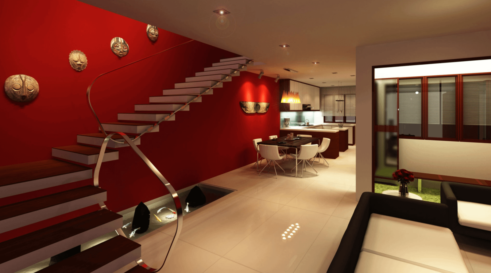 • The interior layout prioritizes flexibility and functionality, with open-plan living areas, integrated storage solutions, and adaptable spaces that can change with the family’s needs over time. The incorporation of the fish pond under the staircase not only enhances the visual appeal but also provides a focal point in the living area, bringing tranquility and a sense of nature indoors.